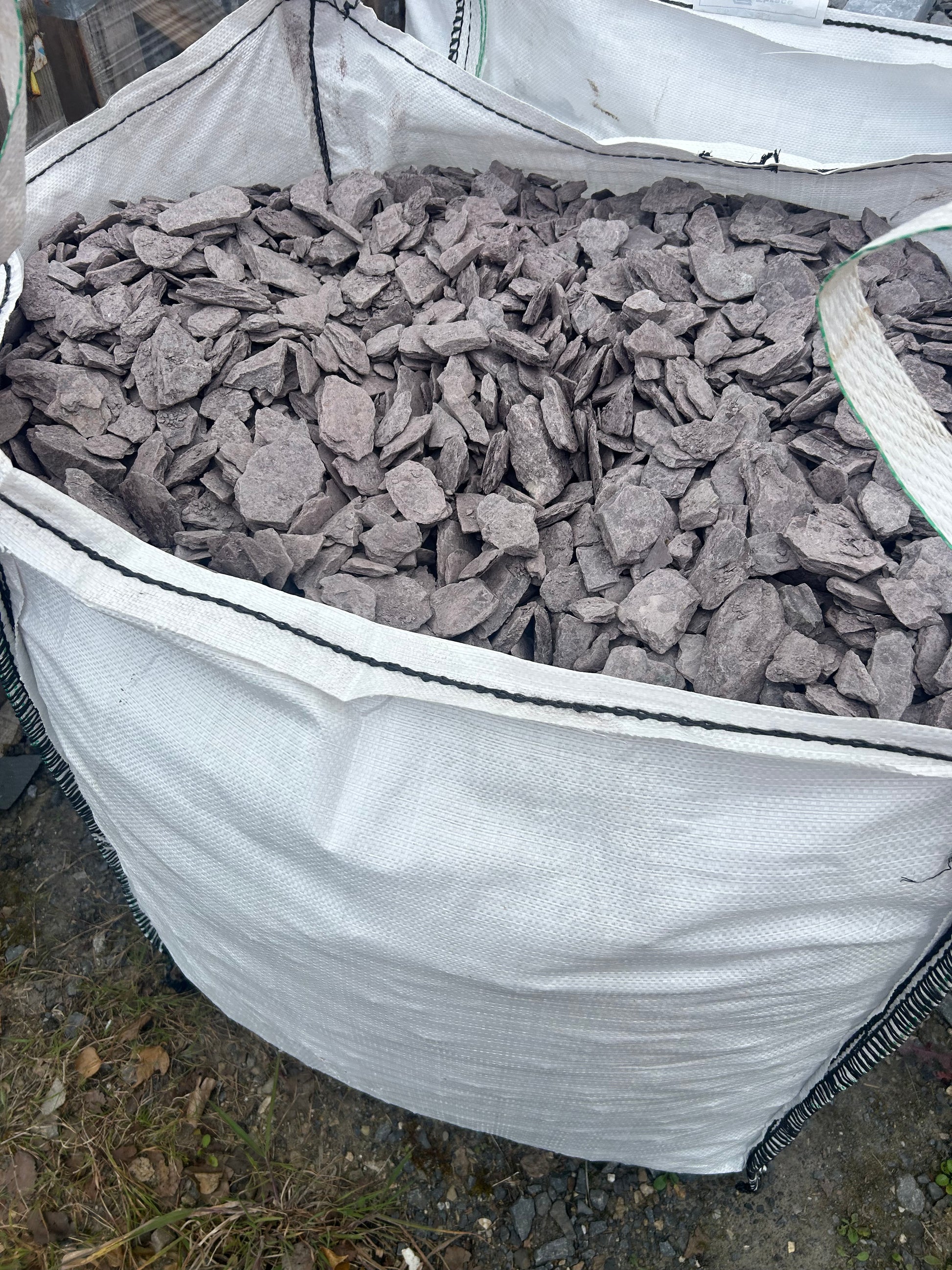 The Achill Red Plum Slate , Garden Mulch from www.wesellstone.com is packed in a large white bulk bag.
