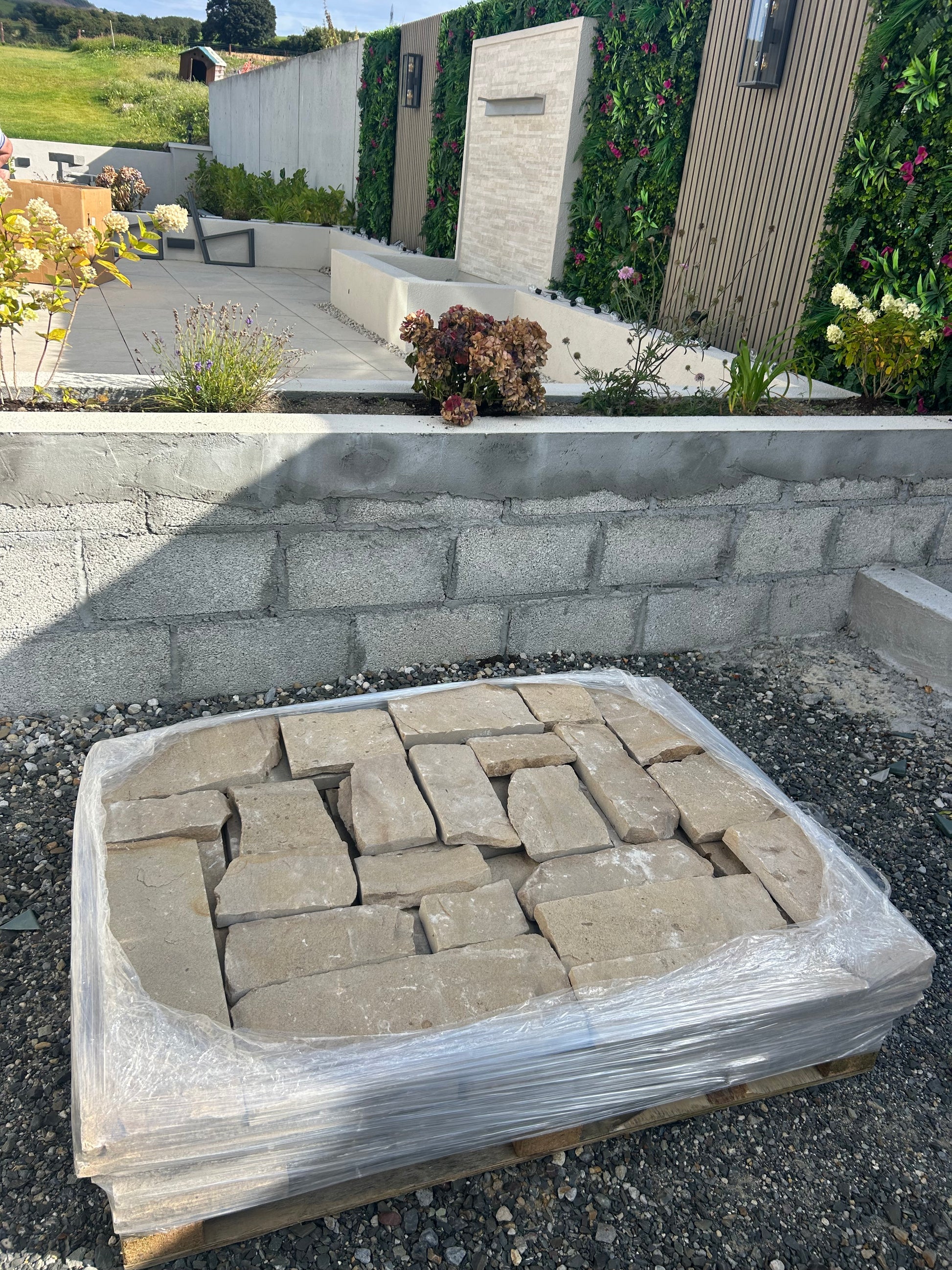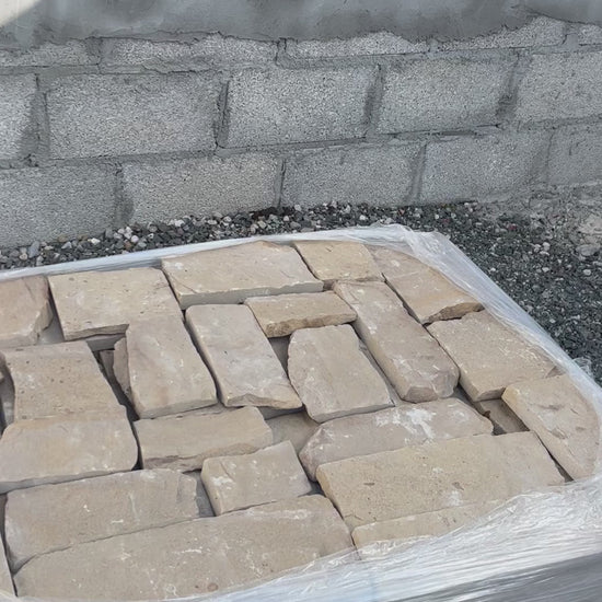 The Donegal Cream Sandstone Cladding from www.wesellstone.com is packed neatly on a pallet with 5m2 or a combination of m2 of cladding and corners per linear m at same rate ( for example 3m2 of cladding and 2 linear meters of corners ). They are the same price per linear meter or square meter.